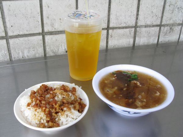 到了新店捷運站後大家都解散了!我則是自己一個人再走回今天來的路。要趕回去參加下午的另一個夕陽團的活動,不過趕路前還是得先填飽肚子,就在景美舊橋附近的店家點了一碗魯肉飯跟赤肉羹還有隔壁泡沫紅茶的茉莉綠茶大背,歐依喜哩!超滿足!