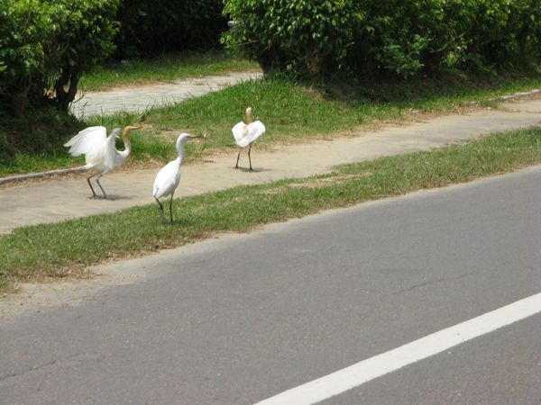 三隻原本要過自行車道的白鷺絲,看到我過緩緩的過來後就又走回去囉!